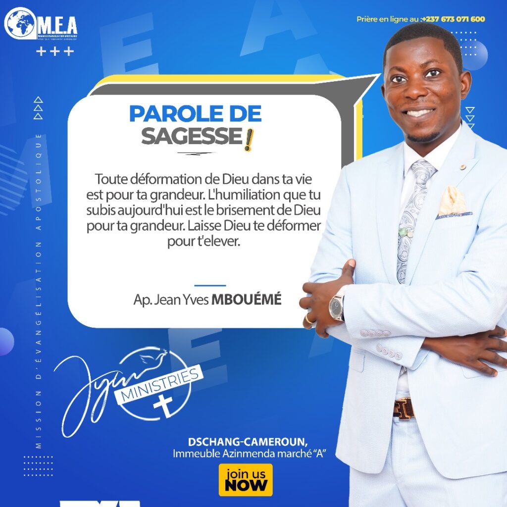 Je vous souhaite la bienvenue sur le site officiel de l’Apotre Jean Yves Mboueme A travers les enseignements et les messages que nous diffusons, je désire que votre mentalité soit transformée, que votre vie soit révolutionnée, et que vous accomplissiez certainement votre destinée.